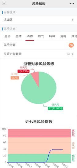 设置“主体”、“消防”、“燃气”、“特设”和“其它”等安全风险等级标签,商贸单位无隐患默认为绿色,存在一般安全隐患变更为黄色,存在重大安全隐患则变更为红色,方便监管部门及时掌握生产经营单位安全隐患状态,为全区安全态势评估分析夯实基础。
