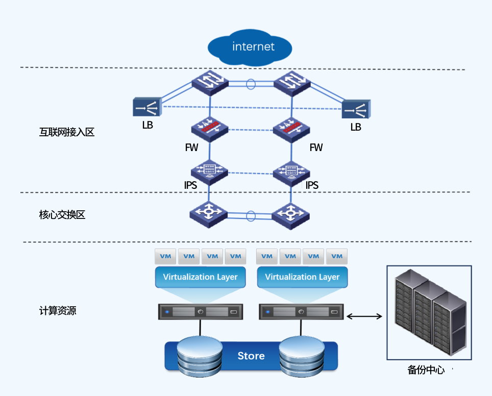 基于Server SAN的新一代数据中心架构将全面整合计算、存储、网络等资源。底层硬件相对简单,物理层面分为网络和计算存储两个层面。